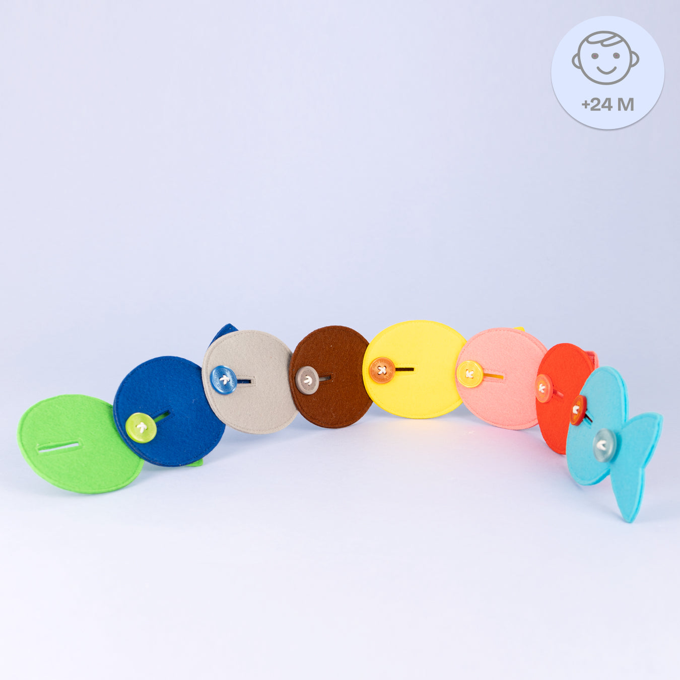 Cette joyeuse chenille invite les enfants à découvrir les couleurs, à s’exercer à boutonner et à développer leur créativité en jouant. Huit éléments colorés en feutrine peuvent être assemblés au visage souriant de la chenille – chaque segment devient ainsi une petite aventure d’apprentissage.